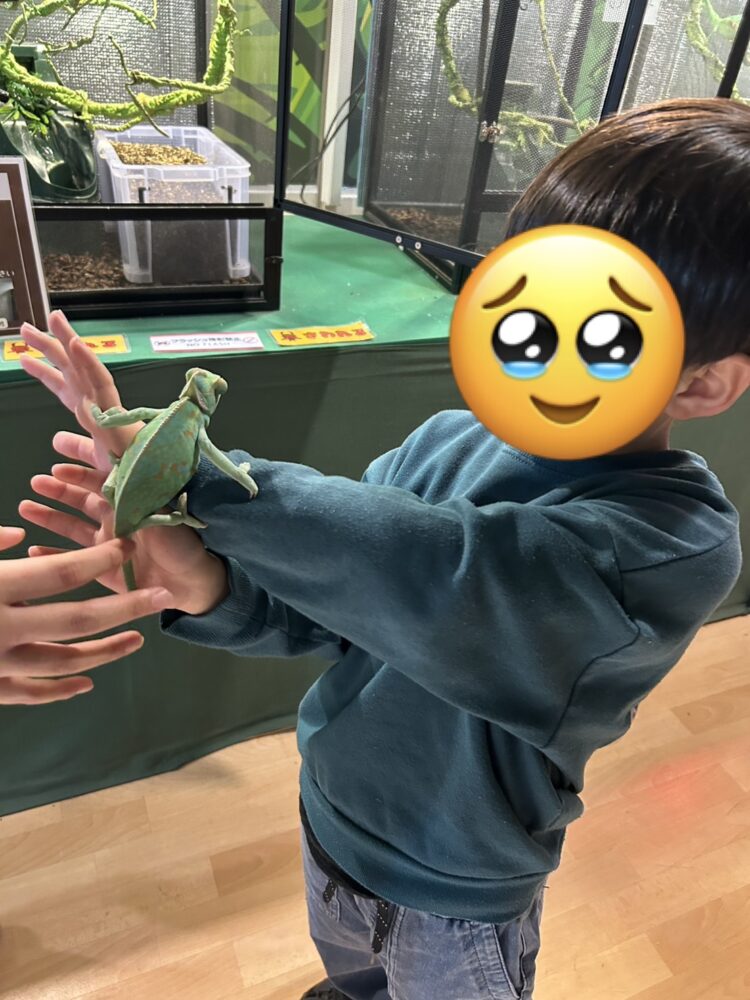 動物エリアでは、なんとカメレオンともふれあい。