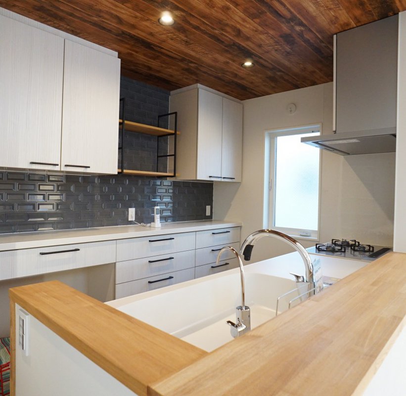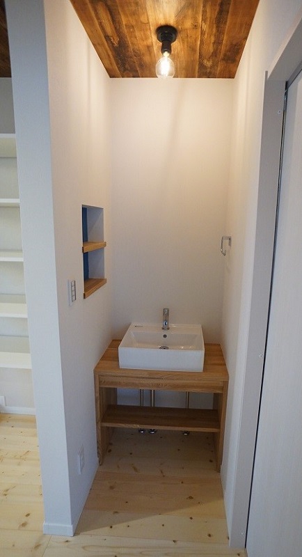 キッチンやミニ手洗いスペースは天井のトーンをそろえて、統一感を持たせました。