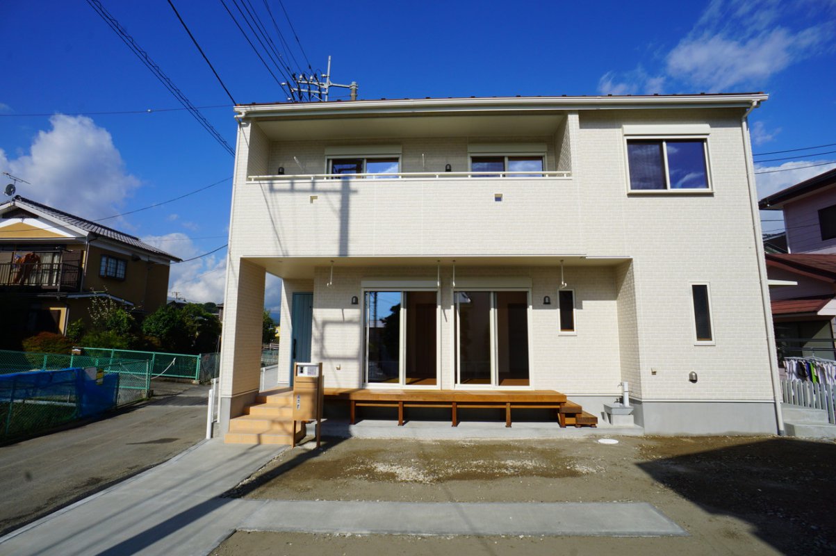 広いパーキングスペースとウッドデッキのあるすっきりとした外観です