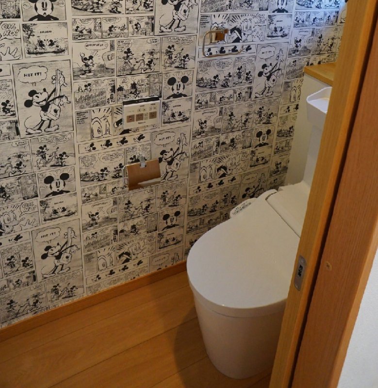 ディズニー好きのご夫妻のための、ミッキーのアクセントクロスが楽しめるトイレ