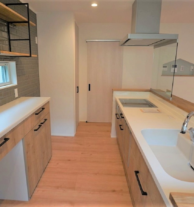 ・背面にタイルをあしらい、オープンのウォールラックを造作、