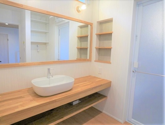 ・オーバルの優しいラインの洗面ボウル、ニッチの収納スペース、
