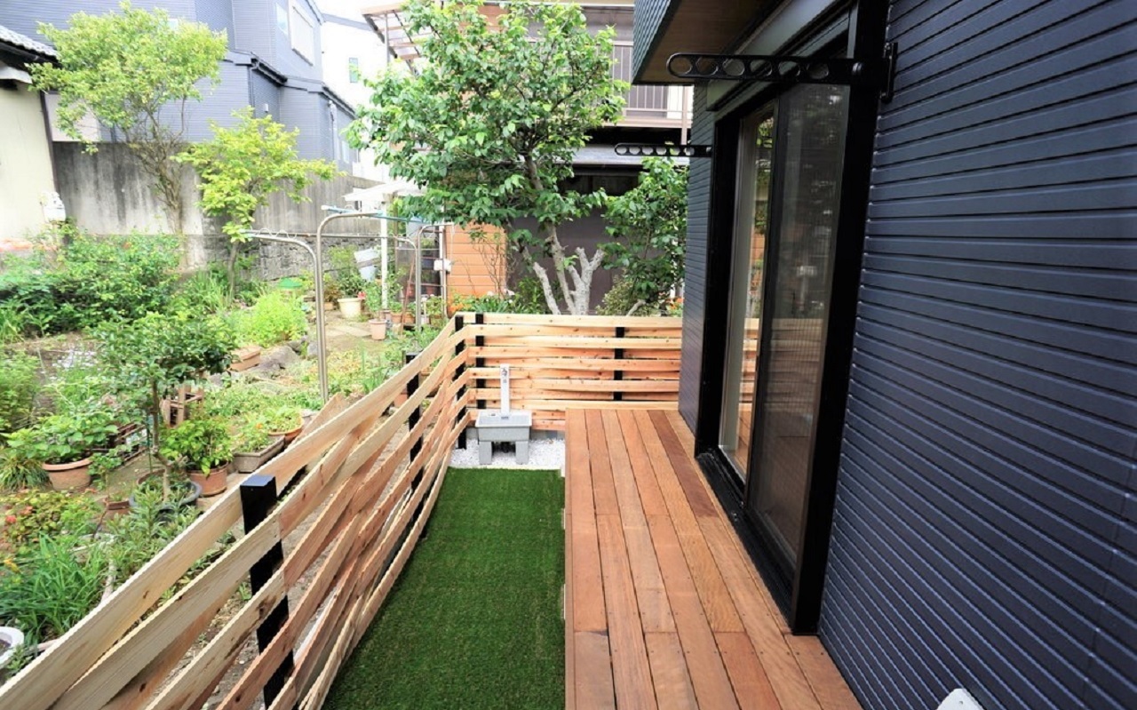 1階リビングに面したウッドデッキには、遊び心を一振りしたウッドフェンス。