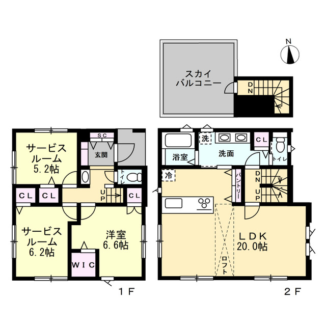 | 間取り | 1LDK+2S+WIC+スカイバルコニー | 間取り内訳 | 洋室6.6 S6.2 5.2 LDK20.0 スカイバルコニー8.0 |