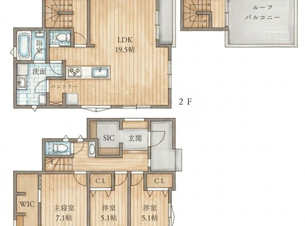 | 間取り | 3LDK+WIC+SIC | 間取り内訳 | 洋室7.1 5.1×2 LDK19.5 |