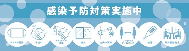 引き続き、弊社店舗の換気、消毒、ソーシャルディスタンス、検温、飛沫飛散防止措置、徹底したマスク着用等、感染予防対策を徹底してまいります。